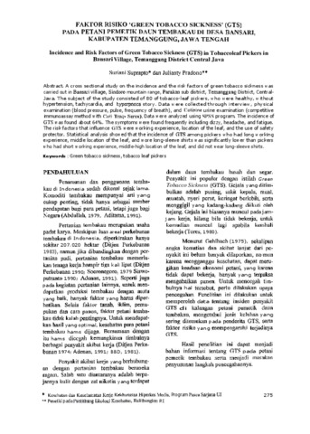 Suprapto, Suriani and Pradono, Julianty (2003) FAKTOR RISIKO 'GREEN TOBACCO SICKNESS' (GTS) PADA PETANI PEMETIK DAUN TEMBAKAU DI DESA BANSARI, KABUPATEN TEMANGGUNG, JAWA TENGAH. Jurnal Ekologi Kesehatan, 2 (3). ISSN 1412-4025