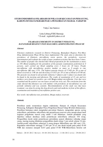 Penelitian untuk menentukan tingkat endemisitas filariasis di wilayah Kecamatan Pemayung, Kabupaten Batanghari Pasca Pengobatan Massal Tahap III telah dilaksanakan. Penelitian bertujuan untuk mengetahui prevalensi filariasis, mengetahui spesies cacing mikrofilaria, periodisitas mikrofilaria dan pemeriksaan reservoir serta mengevaluasi hasil kegiatan pengobatan massal yang sudah 3 kali dilakukan. Jumlah penduduk yang diperiksa sediaan darahnya untuk pemeriksaan mikrofilaria sebanyak 538 orang. Pengambilan darah untuk pemeriksaan periodisitas parasit dilakukan terhadap empat orang, masing-masing dilakukan pengambilan darah setiap 2 jam sekali selama 24 jam. Jumlah positif mikrofilaria sebanyak 8 orang dengan Mikrofilaria rate (Mf rate) 1,5%. Kepadatan mikrofilaria tertinggi 17,493 per 20 cu mm darah terjadi pada pukul 01.00 WIB dan menurun menjadi 0,415 pada pukul 07.00 WIB.Mikrofilaria bersifat sub periodik nokturna ditemukan pada 3 subyek dan 1 orang subyek hanya ditemukan ditemukan pada pagi dan sore hari. Hasil pemeriksaan terhadap 12 ekor kucing dan 2 kera ditemukan adanya dua ekor kucing (satu ekor kucing rumah dan satu ekor kucing yang tidak mempunyai pemilik/liar ) yang positif mikrofilaria dengan spesies Brugia malayi). Kesimpulan dari penelitian ini menunjukkan bahwa filariasis masih endemis dengan periodisitas mikrofilaria bersifat sub periodik nokturna dan merupakan zoonotik. Rekomendasi hasil penelitian ini yaitu agar pengobatan massal dilakukan dengan memberikan obat secara langsung dan meminum obat di depan petugas, pemeriksaan serta pengobatan terhadap kucing yang positif mikrofilaria.