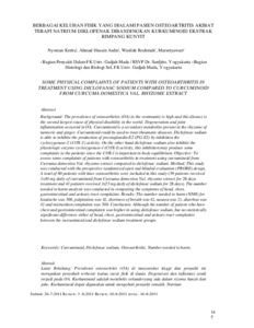 Prevalensi osteoartritis (OA) di masyarakat tinggi dan penyakit ini merupakan penyebab terbesar kedua cacat fisik di dunia. Degenerasi dan inflamasi sendi terjadi pada OA. Kurkuminoid adalah metabolis sekunderyang ada dalam rizoma kunyit dan jahe. Kurkuminoid dapat digunakan untuk mengobati penyakit rematik. Natrium diklofenak mampu menghambat produksi prostaglandin-E2 (PG-E2) dengan penghambatan aktivitas cycloxygenase-2 (COX-2). Di sisi lain Natrium diklofenak juga menghalangi aktivitas jisiologis enzim cycloxygenase-l (COX-I), penghambatan ini dapat menyebabkan beberapa keluhan dari pasien mengingat COX-l penting dalam keseimbangan tubuh. Tujuan: Untuk menilai beberapa keluhan dari pasien dengan osteoarthritis dalam pengobatan menggunakan kurkuminoid Curcuma domestica Val dari. rhyzome ekstrak dibandingkan dengan natrium diklofenak. Metode: Penelitian ini dilakukan dengan Penelitian ini menggunakan desain uji klinik secara acak terbuka dan membuta (PROBE). Sebanyak 80 pasien dengan osteoarthritis lutut dilibatkan dalam penelitian ini (39 pasien menerima 3x30 mg sehari dari kurkuminoid dari ekstrak Curcuma domestica Val. Rhyzome selama 28 hari pengobatan dan 41 pasien menerima 3x25 mg sehari natrium diklofenak selama 28 hari). Jumlah yang diperlukan untuk analisis bahaya dilakukan dalam membandingkan gejala kepala, dada, keluhan gastrointestinal dan saluran kemih. Hasil: The number needed to harm (NNH) untuk sakit kepala adalah 500, palpitasi adalah 42, sesak napas adalah 42, mual adalah 21, diare adalah 42 dan keluhan berkemih adalah 500. Kesimpulan: Meskipun jumlah pasien yang memiliki dada dan keluhan gastrointestinal lebih tinggi pada menggunakan natrium diklofenak, tetapi tidak ada perbedaan statistik yang signifikan baik dari kepala, dada, keluhan gastrointestinal dan saluran kemih antara kelompok natrium diklofenak kurkuminoid dan pengobatan.